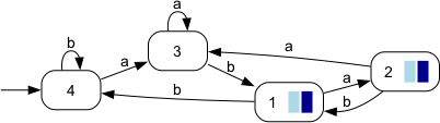 ExampleThe Rabin automaton variant of the eventually-allways-alternate example is again defined over Sigma={a, b} to accept Sigma*(ab)^w.