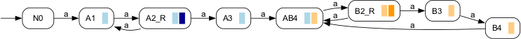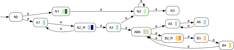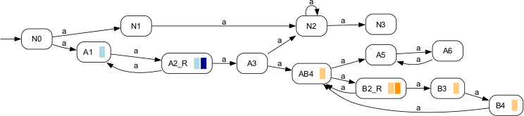 Depending on the signature, lifeness is required w.r.t. at least one of the provided Rabin pairs. Example:![]() For the blue Rabin pair, the life states are reported as {N0, A1, A2_R}. For the orange Rabin pair, the life states are reported as {N0, A1, A2_R, A3, AB4, B2_R, B3, B4}. For the green Rabin pair, no life states exist. Applying IsRabinTrim to the above automaton returns false because there exists accessible states, that are not life, e.g., N1 RabinTrimDelete states that do not contribute to the accepted language. Signature:RabinTrim(+InOut+ RabinAutomaton RAut) RabinTrim(+In+ RabinAutomaton RAut, +Out+ RabinAutomaton RAutRes) Detailed description:Trim a given Rabin automaton RAut by removing states that are not life and/or not accessible; see also RabinLifeStates. The accepted language Rm(RAut) is not affected.