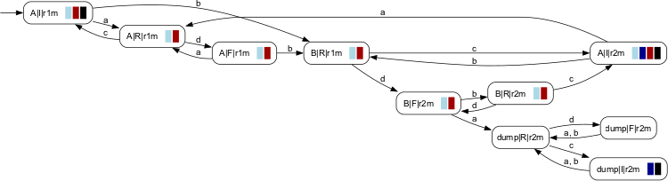 For the specification, we use the third vriant, i.e., start with any process A or B, eventually switch to B, and, only on success turn back to A or B. Here, we have encoded the Buechi appeptance condition as a single Rabin pair and have extended the transition structure to a full automaton.