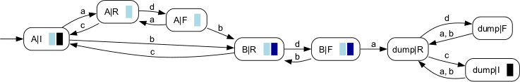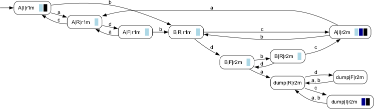 Parameter Conditions:Arguments must have matching alphabets Sigma. Arguments must be full, i.e., generate Sigma^w RabinBuechiProductAssemble an automaton to accept the intsection of given Rabuin/Buechi accepted lanuage. Signature:RabinBuechiProduct(+In+ RabinAutomaton RAut, +In+ Generator BAut, +Out+ RabinAutomaton GRes) Detailed description:Given a Rabin automaton RAut and a Buechi automaton BAut, compose a Rabin automaton GRes on the product augmented state set (see BuechiProduct). Set the Rabin acceptance condition such that accepted words are those accepted by both arguments; i.e., Rm(Gres) = Rm(RAut)∩Bm(BAut). To facilitate controller syhnthesis, we also set the Buechi acceptance to appcept Bm(BAut). This feature requires RAut to be full. Example: