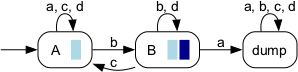 Applying IsRabinTrim to the above automaton returns true. RabinBuechiAutomatonAssemble an automaton to accept a given Rabin/Buechi accepted lanuage. Signature:RabinBuechiAutomaton(+In+ RabinAutomaton RAut, +In+ Generator BAut, +Out+ RabinAutomaton GRes) Detailed description:Given a Rabin automaton RAut and a Buechi automaton BAut, compose a Rabin automaton GRes on the product state set. Then lift acceptance conditions such that the Rabin accepted language matches that of RAut and the Buechi accepted language matches that of BAut; i.e., Rm(RAut) = Rm(Gres) and Bm(BAut) = Bm(Gres). Example:
