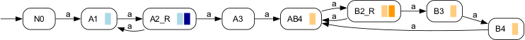 Depending on the signature, lifeness is required w.r.t. at least one of the provided Rabin pairs. Example:![]() For the blue Rabin pair, the life states are reported as {N0, A1, A2_R}. For the orange Rabin pair, the life states are reported as {N0, A1, A2_R, A3, AB4, B2_R, B3, B4}. For the green Rabin pair, no life states exist. Applying IsRabinTrim to the above automaton returns false because there exists accessible states, that are not life, e.g., N1 RabinTrimDelete states that do not contribute to the accepted language. Signature:RabinTrim(+InOut+ RabinAutomaton RAut) RabinTrim(+In+ RabinAutomaton RAut, +Out+ RabinAutomaton RAutRes) Detailed description:Trim a given Rabin automaton RAut by removing states that are not life and/or not accessible; see also RabinLifeStates. The accepted language Rm(RAut) is not affected.